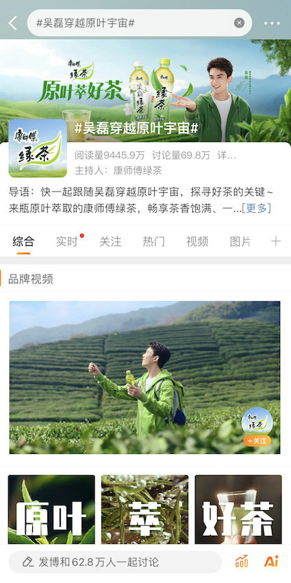 线上,康师傅绿茶在微博、抖音、小红书等社交媒体全面释放,同步在爱奇艺、优酷等头部视频平台强势曝光,不断占领“原叶萃好茶”的消费者心智,最大化地聚集了传播流量,#吴磊穿越原叶宇宙#话题更是冲上微博热搜,截至目前,话题阅读量已高达9400W,实力占据热度制高点。