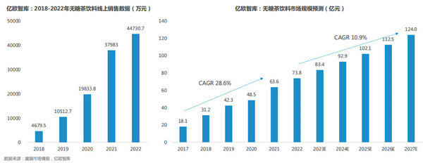 而在即饮茶这个第一赛道上,无糖即饮茶的份额呈现明显的上升趋势。亿欧智库发布的《2023中国无糖茶饮行业白皮书》显示,我国无糖茶饮料从2018到2022年线上销售规模突破10倍,预计到2025年市场规模将突破百亿大关,到2027年将达到124亿元。