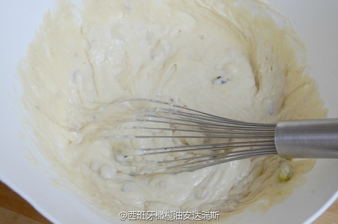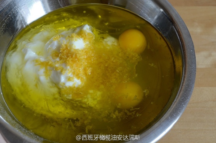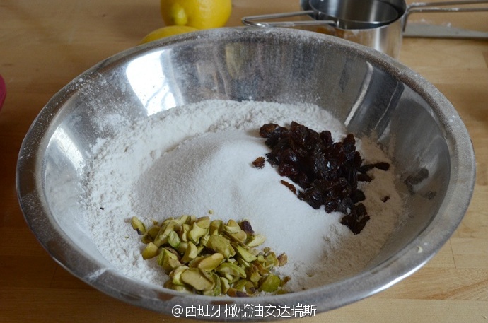 【食材】-低筋面粉2杯,-细砂糖1杯,-葡萄干30克,-无盐瓜子/开心果仁30克,-¼汤匙细盐,-Andarrios 西班牙安达瑞斯橄榄油2/3杯,-低脂酸奶1杯,-柠檬2个,果皮磨碎,果肉榨汁,-鸡蛋2只