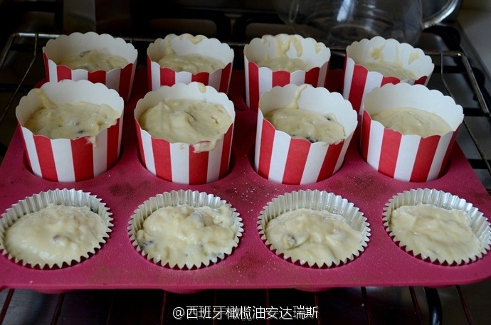将面糊放进杯中。个人更喜欢锡纸杯。放进烤箱15-20分钟后取出。
