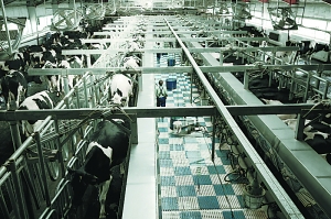 在标准化的挤奶大厅里,奶牛们听着音乐自动挤奶