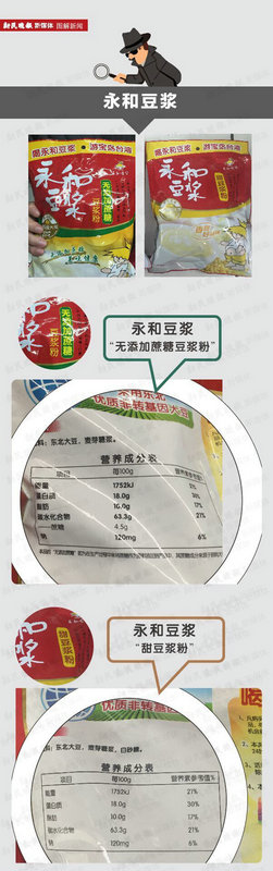 永和豆浆生产的“无添加蔗糖豆浆粉”与“甜豆浆粉”也存在相似的问题,“甜豆浆”的配料上一眼就能看出多一项白砂糖,可是和维维“异曲同工”的是,营养成分表内的数字连小数点后面,甚至连毫克数都是相同的。