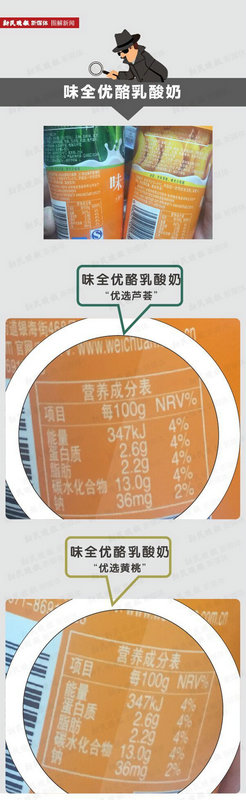 例如乳制品类的味全优酪乳酸奶,有“优选黄桃”与“优选芦荟”两款产品。在配料中,因口味不同,前者加入了黄桃果肉与椰果,后者则是加入了库拉索芦荟凝胶(添加量15g/100g),配料的显著不同,却根本没有影响到它们的营养成分表,每100克酸奶所含的能量(347千焦)、蛋白质(2.6克)、脂肪(2.2克)、碳水化合物(13.0克)、钠(36毫克)五项指标完全相同。