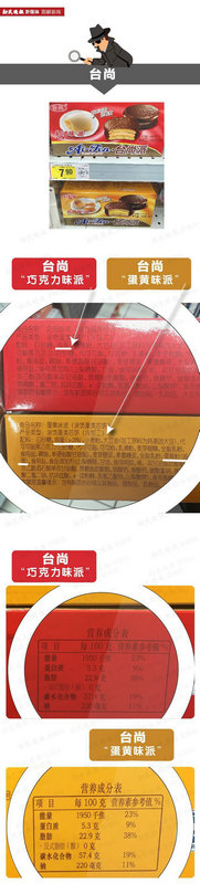 而休闲食品中这样的现象可谓随心所欲。以台尚“巧克力味派”与“蛋黄味派”为例,两种口味的派配料中有两处明显不同:一处是,后者在配料鸡蛋后注明:(>20%),而前者虽然也有鸡蛋,但并未注明范围。另一处为,后者含有蛋黄粉(鸡蛋),而前者不含蛋黄粉。
