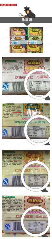 下面登场的徐福记“草莓酥”“香橙酥”“凤梨酥”“芒果酥”四款产品,口味更加多样,然而营养成分却依旧是出奇地一致。它们的配料各自含有不同比例的草莓粉、橙果肉、菠萝果肉、芒果果肉。馅料的差别如此之大,一比较后发现每100克所含的能量1787千焦、蛋白质3.2克、脂肪17.6克、碳水化合物62.1克、钠125毫克,精确到小数点后,分毫不差。