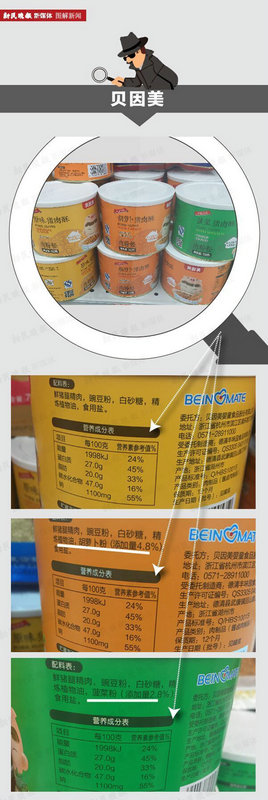 其他的加工食品中如此情况也屡见不鲜。贝因美三款不同的肉松粉: “原味”“胡萝卜”“菠菜”,在和“原味”其他配料一致的情况下,“胡萝卜”味含有胡萝卜粉(添加量4.8%)、“菠菜”味则是菠菜粉(添加量2.8%)。但是一看营养成分表,1998、27.0、20.0、47.0、1100,又是五个一模一样的数字!