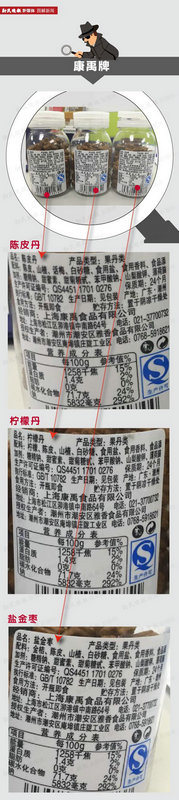 不仅仅在大超市中,便利店内也有此类现象。记者在喜士多便利店内购买了三小瓶果丹食品,康禹牌“陈皮丹”“柠檬丹”“盐金枣”,配料中各自独有话梅、柠檬、金桔,可是三者营养成分表清清楚楚写着:在每100克该产品中含有能量都为1258千焦、蛋白质1.4克、脂肪0克、碳水化合物71.7克、钠5832毫克,完全一致。