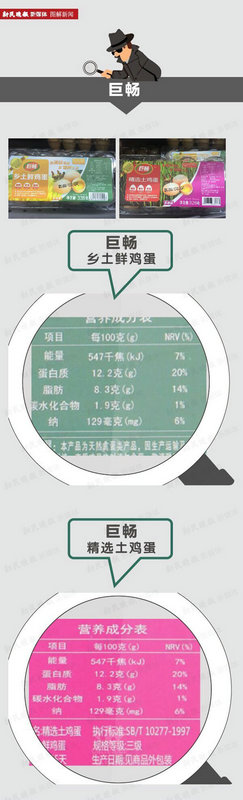 记者在家乐福网上商城搜索后发现,有名为“巨畅乡土鲜鸡蛋”和“巨畅精选土鸡蛋”的两种不同的鸡蛋,产品配料写的都为鲜鸡蛋,营养成分表却是一样的:能量547千焦/100克、蛋白质12.2克/100克、脂肪8.3克/100克、碳水化合物1.9克/100克、钠129毫克/100克。