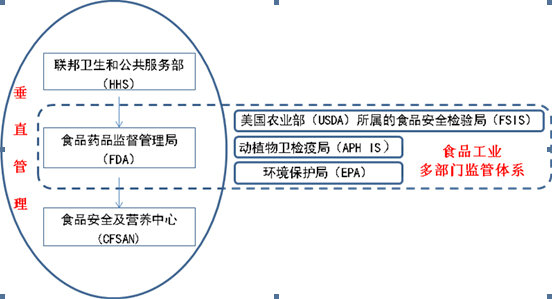 FDA实行多部门相结合的食品工业一体化管理模式。美国联邦政府有十多个部门负责食品安全工作。其中,负责保障食品安全和消费者利益的联邦机构主要有:卫生和公共服务部(DHHS)下的食品和药品管理局(FDA),美国农业部(USDA)所属的食品安全检验局(FSIS)和动植物卫检疫局(APHIS)以及环境保护局(EPA)。这些部门主要按食品类别进行分工监管,并与各州地政府一起形成美国的食品安全监管体系。