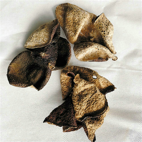 陈皮按等级分为两等:一等货片张较大,表面橙红色或红黄色,有无数凹入的油点,对光照视清晰,内面白黄色,质稍硬而脆,味辛苦;二等货片张较小,间有破块。表面黄褐色或黄红色,暗绿色,内面灰黄色,较松泡,质硬而脆,味微苦。