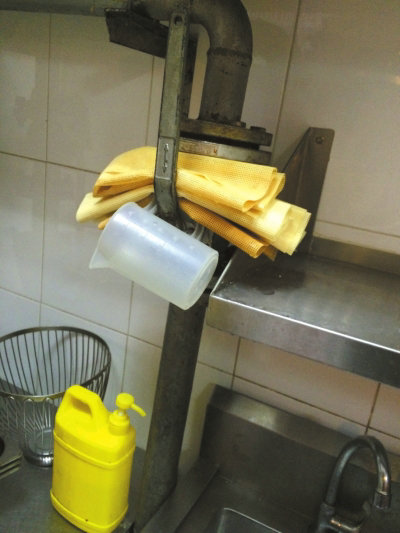 随后,该员工把下水管道下面的滤水箱打开,把里面米饭等厨余垃圾倒出后,又用清洗布擦拭表面的脏物。记者当场提出质疑:“清洗布混用有区分吗?有无专门擦拭餐盒的清洗布?”该员工表示,“没有,哪能分那么细,就这么一大堆,洗什么都是它。”
