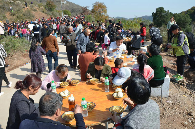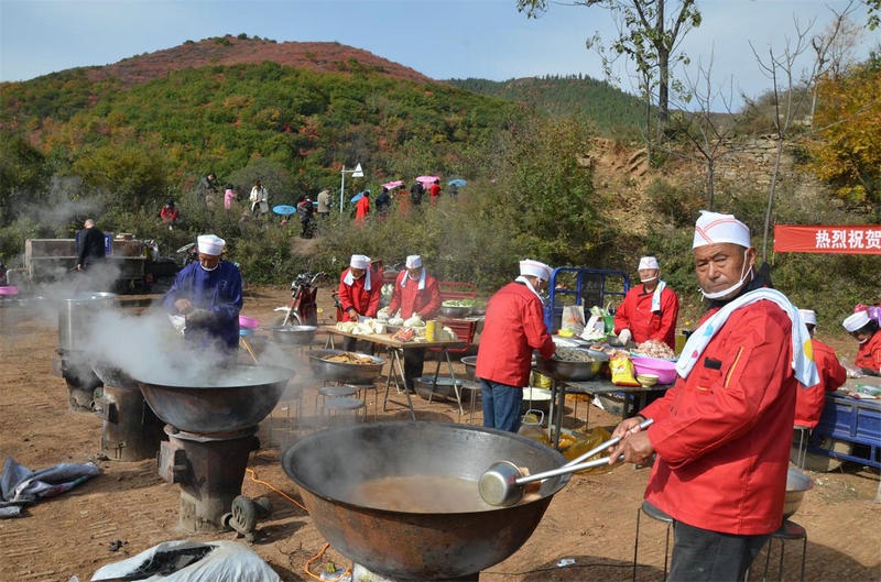 在水泥路的旁边,摆了一百多张圆桌子,参加活动的摄影师、演出人员还有游客,大家不管认不认识,都围在一张桌子上坐下,每人一搪瓷碗大锅菜,蒸馍随便吃,每一位尝过这碗菜的人,都对老人们的手艺赞赏有加。摄影记录|张根栋