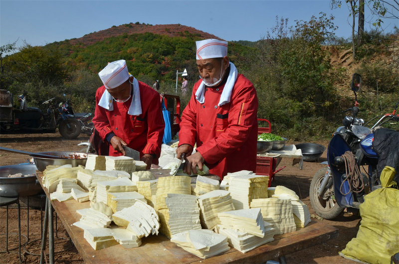 做一碗大锅烩菜,要经过卤、炸、炒等环节,这两位师傅正在切豆腐,豆腐在大锅菜里的吃法往往是先炸,然后再下锅烩,所用食材除了豆腐,还有卤肉、粉条、白菜等乡村常见的季节菜。