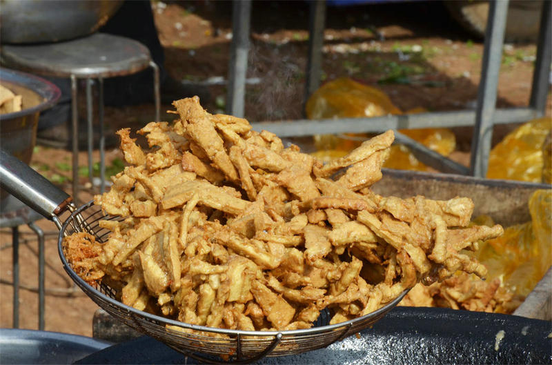 厨师正在炸的这种食材叫“豆腐鱼儿”,是豆腐切成小鱼状,然后裹面糊下油锅炸成,豆腐之所以会有这种做法,跟过去乡民对大鱼大肉的向往有关,鱼不容易吃到,就想办法做出形似的东西来替代,这也算是民间厨师的一种智慧。