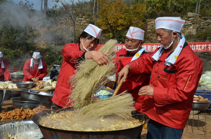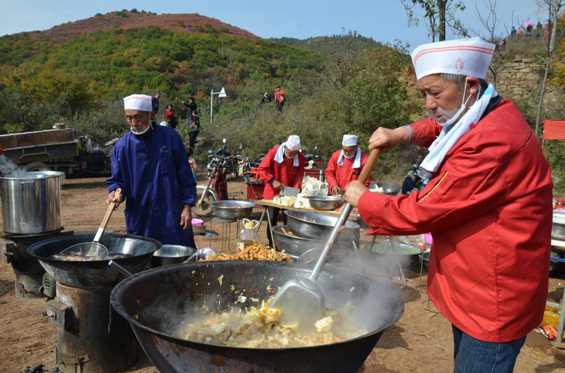 在河南禹州鸠山镇一座山脚下的空地上,有一群穿着红衣戴着白帽的老人正在五口大锅前忙碌着,他们是来自附近村庄里的乡村厨师,今天的任务是做出至少一千碗可口的大锅烩菜,免费给路过的游人品尝。近些年大锅烩菜屡屡在网络上曝光,让这种逐渐消失的乡土菜再次进入大众视野。 (来自:乡土河南)