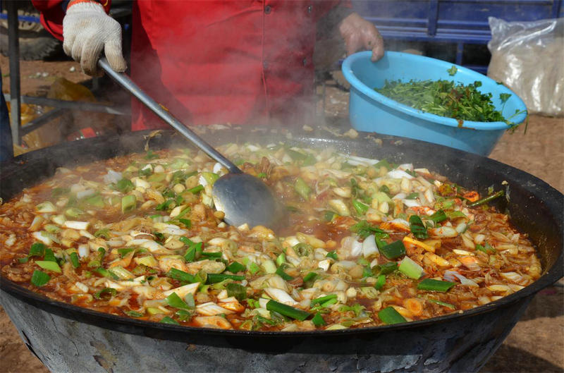 做大锅菜离不开粉条,可以说它是除了肉之外最重要的一种食材,这些成捆的粉条洗过之后没有泡软,直接放锅里熬煮,这种豪迈的做法更透出了浓重的乡土味。