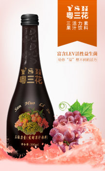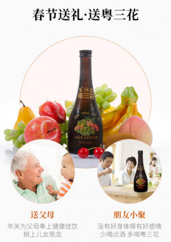 粤三花·三活力素,在配方中特殊融合了LEV菌液、蜂蜜、果汁,中和了果汁腻、酒味冲的口味,满足老少的味蕾。