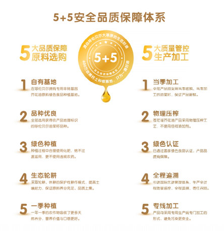 呼伦贝尔农垦集团一直肩负着保证国家食品安全的重任,根据自身生态环境以及地理优势经过科学耕种生产出了一款生态芥花油——“苍茫谣芥花油”。这款“苍茫谣芥花油”具有物理压榨、非转基因、无添加剂的特征,通过5大品质保障原料选购和5大质量管控生产加工,形成“5+5安全品质保障体系”,做到真正天然的绿色食品,符合现代消费者对高营养、高品质、食用安全的追求。