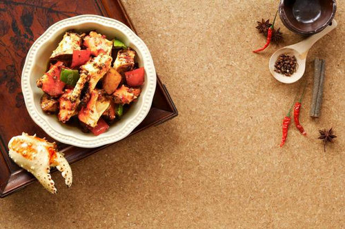 3.将甜面酱、花椒、干辣椒、八角、桂皮、姜黄粉和糖炒出香味后,放入王蟹、土豆和青红椒炒匀,加适量水略煮后加盐调味即可。