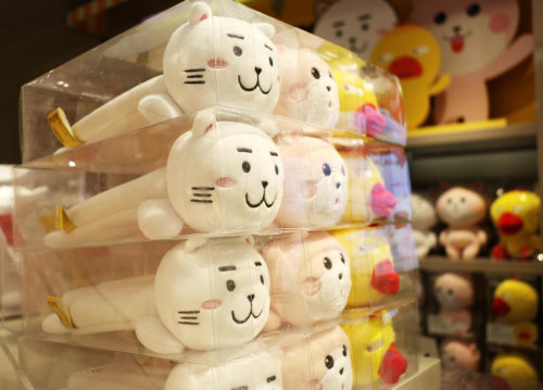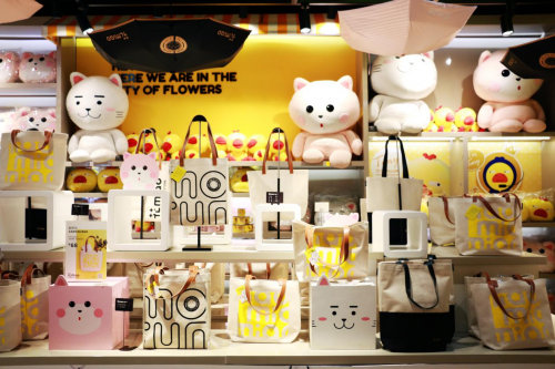 此外,步入花miao店内,惊喜不断。店内装饰的主体色调和3个IP卡通玩偶的颜色相映成趣,黄色温暖时尚、粉色柔软浪漫、白色简洁亲切。除了玫瑰点心,花miao店内还陈列着由3个IP形象衍生而来的毛绒公仔、生活家居等上百种文创商品,琳琅满目让人爱不释手。在暖光灯的照射下,整个店带给人一种舒适放松的感觉,清新有格调的风格随手一拍都是非常有质感的时尚大片。