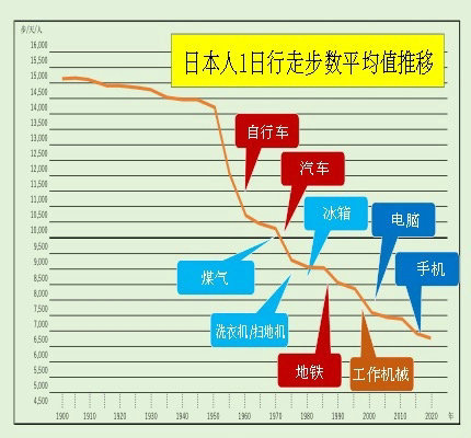 上图是日本人过去100年每日步行数平均值变化图。随着交通工具的变化、家务电器的开发、机械化等众多机器文明的发展,日本人每天的平均步行数不断减少。1950年以前,人们每天平均走15000步,现在每天只需要走6000步左右,减少了一半以上。1万步也仅相当于7公里,现代生活中的运动缺乏可谓是世界性趋势。