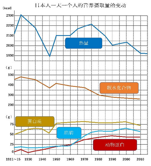 这张图显示的是日本人过去100年的个人营养摄取量变化表。
