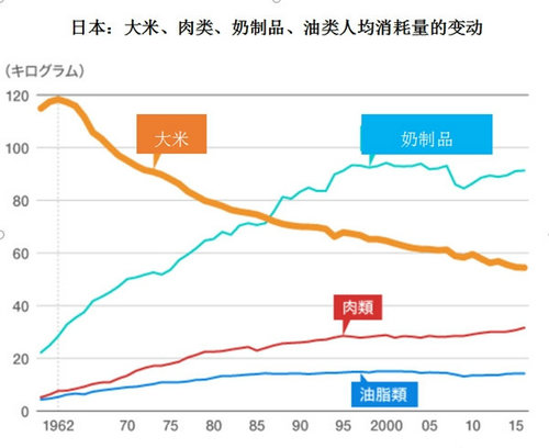 日本人以大米为主食,1963年,日本的人均大米消费量为118公斤,此后逐年下降。到2016年,大米人均消耗量减半降至54公斤。 另一方面,乳制品消耗量持续增加,尤其是酸奶,日本一年人均酸奶消耗量在7kg以上,几乎是中国的两倍。肉类和脂肪的消耗量变化相对比较稳定。
