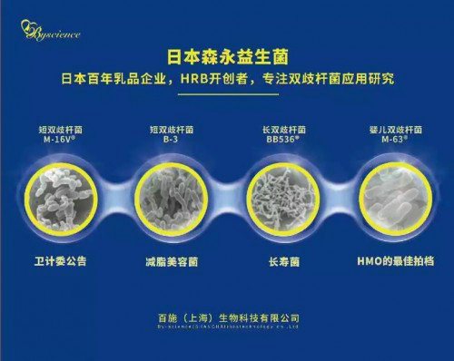 百施生物是日本森永乳业益生菌在中国大陆的独家授权代理商。森永乳业是日本最大的乳制品公司之一,同时也是人体共生双歧杆菌(HRB)的开创者。森永乳业擅长创新技术,向全世界客户提供各类乳制品和其他有益功能成分。自20世纪60年代开始,森永乳业一直专注益生菌双歧杆菌的应用研究,以便深入了解益生菌维护人体健康的原理。在以上两场高水平的行业盛会中,百施生物展出了日本森永乳业的多款益生菌菌株,包括:短双歧杆菌 M-16V、短双歧杆菌 B-3、长双歧杆菌BB536及婴儿双歧杆菌 M-63。