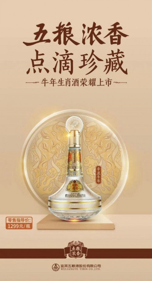 2020年“双12”当天,由五粮浓香公司推出的“五粮浓香·辛丑牛年生肖酒”在京东、天猫、小米有品、苏宁易购四大平台的五粮液、五粮浓香官方旗舰店同步开启线上预售。该生肖酒的首度亮相,引发了消费者和白酒行业的高度关注。据了解,该酒每瓶888mL,限量发售99999瓶(电商渠道配额10%),市场零售指导价为1299元/瓶,每瓶酒均内附一瓶一证的收藏证书及编号,极具收藏价值。