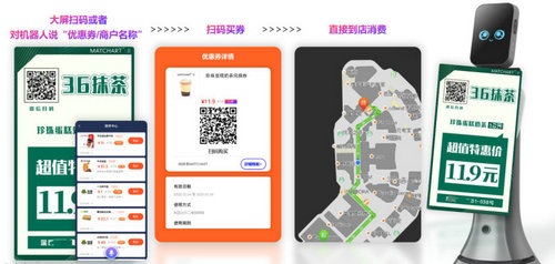 一旦消费者对优惠券感兴趣后,通过机器人大屏扫码支付即可下单,同时机器人自带地图又可导航到店,这些无疑可以帮“种草”的消费者“拔草”,大大提高了随机消费者转化为到店用户的效率。