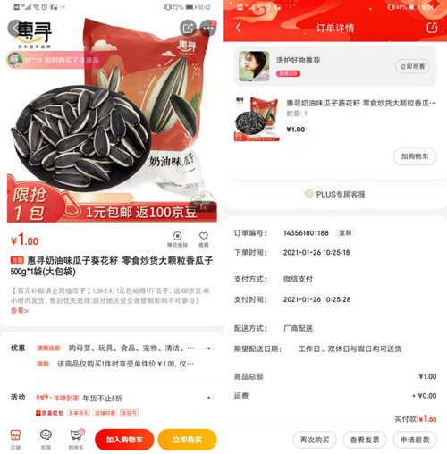 据了解,京东在1月26日至2月4日发起“请全国人民嗑瓜子”活动,主打“更多、更好、更实惠”理念的京东自有品牌惠寻也参与其中。每天瓜子准时开抢,抢到的消费者只需支付1元钱,抢到后5个工作日内返100京豆,可折抵1元现金花,相当于免费请全国人民嗑瓜子,先到先抢先得,做好准备噢!