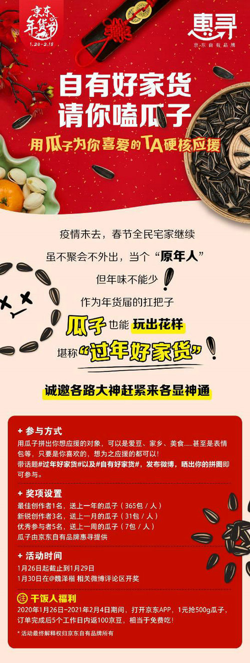 其实,在心意年礼上,请大家吃瓜子这事儿京东是认真的!除了春节请全国人民嗑瓜子,还想长期承包你的瓜子!