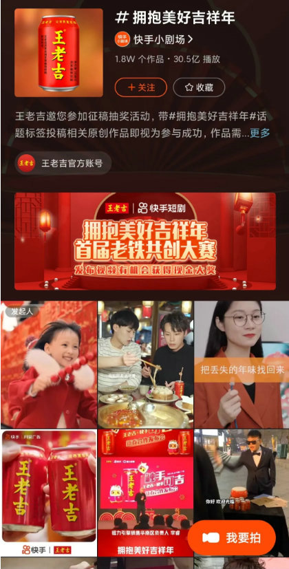 举个例子,今年春节王老吉与快手联合发布的“拥抱美好吉祥年”主题下,网友对“吉祥年”这个概念进行多元表达与输出,已有1.8万个共创作品参与发布、播放量超30.5亿。