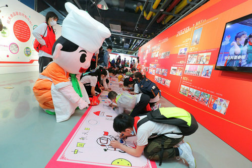 ▲武汉小朋友共绘航天梦想与武汉名胜的画卷