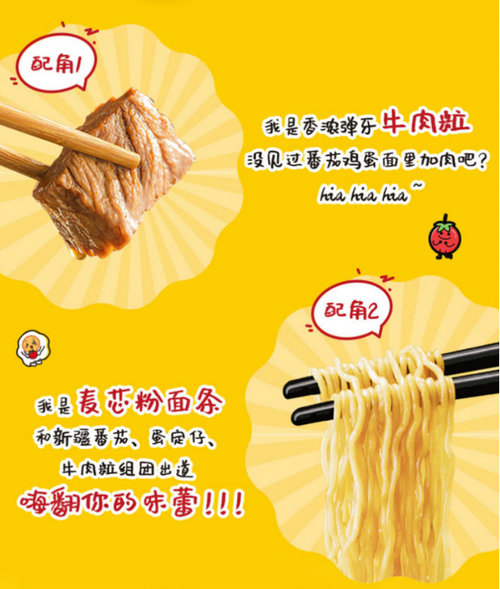 对于新品番茄鸡蛋牛肉面的包装设计,康师傅也花了颇多心思。该产品将番茄的延展造型设计为品牌图标,配以个性化字体,颇具心思地传达出了产品的核心卖点。同时,又以明黄色为主色调,以阳光为底纹,张扬而不张狂,温和、个性的氛围感直接拉满,在视觉效果上传达出一种“阳光、活力、美味”的亲近感。同时外包装上卡通化的形象“蛋定仔”,以及番茄鸡蛋牛肉面的新颖摆盘方式,更加直观地体现了品牌年轻化调性、营造了场景感。
