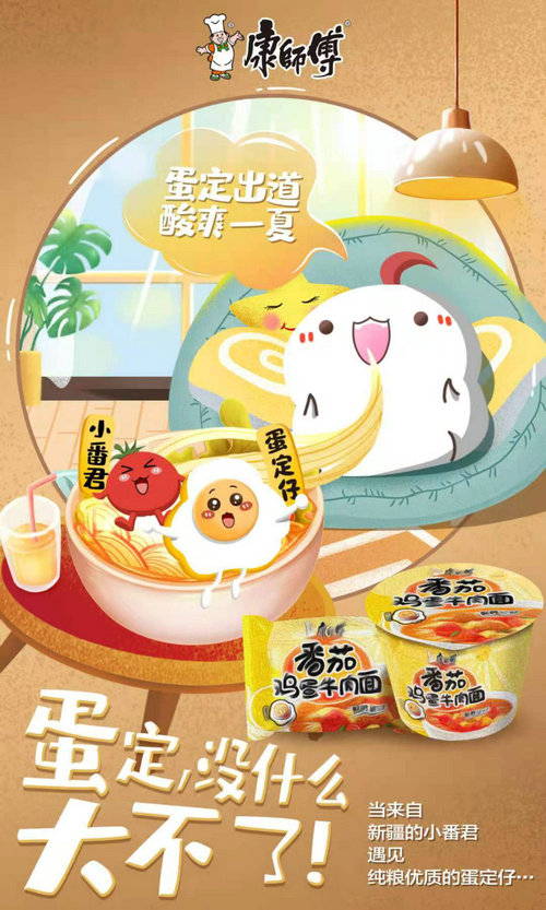 为了更贴近年轻群体的喜好和营销风格,康师傅为番茄鸡蛋牛肉面量身打造了独具个性的IP形象——“蛋定仔”。卡通化的鸡蛋拥抱番茄的独特造型不仅传达了产品的核心卖点,而且整体形象灵动、可爱,迎合了当下年轻人“万物皆可萌”的独特爱好。“蛋定”又意为“淡定”,这一情绪词汇与年轻人“保温杯里泡枸杞”、“佛系青年”、“健康生活”等标签人设吻合。寓情感于IP,这也是康师傅打造与年轻人情感链接的一项重要尝试。
