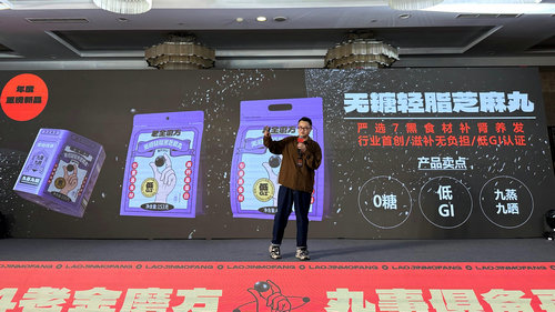 老金磨方在发布的重磅新品矩阵中,行业首创的低GI无糖轻脂芝麻丸极为亮眼。老金磨方CMO江侃岌也在新品发布上重点介绍了这一产品。无糖轻脂芝麻丸创新采用LTCP冷榨技术,相较老金磨方经典黑芝麻丸,脂肪含量减少约34%,九蒸九晒的古法传统工艺最大限度保障芝麻天然营养留存。值得一提的是,该款产品是首款获得低GI产品认证,同时做到了0糖、低脂的芝麻丸,更加贴合当前消费者控糖减脂的健康消费需求。在包装工艺上,老金磨方无糖轻脂芝麻丸使用0.5秒充氮锁鲜技术,保障产品新鲜度,拥有专利的六角铁罐包装寓意六合六顺,在传递中国传统文化的同时,也大大提升了包装的二次利用率。