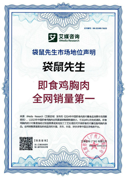 2024年2月,袋鼠先生获全球新经济产业第三方数据挖掘和分析机构iiMedia Research(艾媒咨询)授予的“即食牛肉全网销量第一”和“即食鸡胸肉全网销量第一”双项市场地位声明认证。