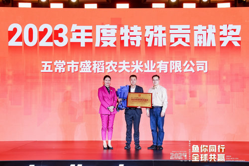 因为盛稻农夫米业的这份坚定与担当,其与鱼你在一起的合作更加深入与密切。大会上,魏总亲自为王总颁发了“特殊贡献奖”荣誉奖牌。这不仅是鱼你在一起对盛稻农夫米业过去一年辛勤付出与突出贡献的充分肯定,更是对其未来持续发展、深化合作的期许。