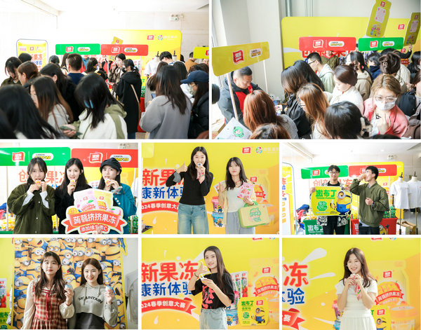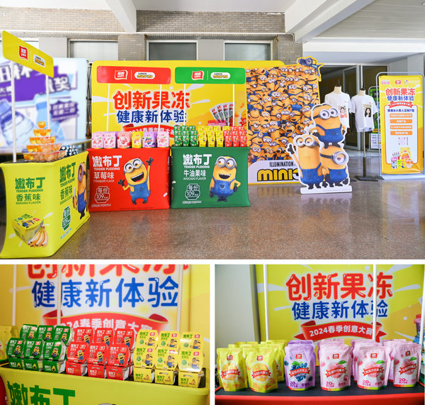多款创新果冻系列产品“轮番上阵”,疯狂圈粉大学校园里的“果冻脑袋”,共同解锁“健康轻负担”、简单而美好的味蕾享受。更有小黄人联名果冻以及专属打卡区高燃登场,成为众多学子的青春焦点。同学们手握美味、热情点赞,便是最鲜活的种草认证!