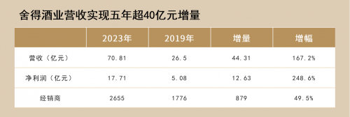 尤为惹眼的是,舍得酒业2019年至2023年的营收复合增长率达27.85%,名列行业前列,净利润复合年增长率也高达45%。细化到经营层面,舍得酒业的市场拓展和全国化、全球化步伐大幅提升。2019年至2023年,省外市场营收从16.58亿元增至46.78亿元,增幅182.1%;经销商数量从1776个增加至2655个,增幅近50%;国内区县城市覆盖率超过85%,拥有100+千万规模以上市场;海外已登陆五大洲,产品进入全球33个国家和地区。