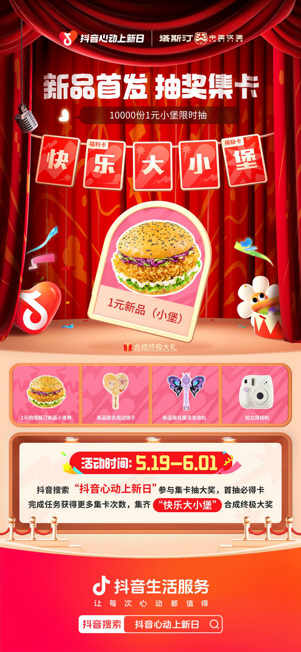 谁还没有小时候狂买干脆面集卡的经历?熟悉的童年玩法再度回归,抖音生活服务「抖音心动上新日」联合塔斯汀打造了抽奖集卡会场,通过直播间、上新日话题页、搜索页等位置,进入「抖音心动上新日塔斯汀新品首发集卡有礼会场」即可参与活动。