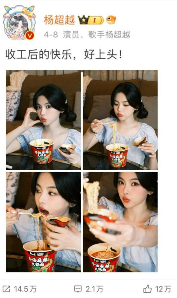 在抖音、微博、小红书等社交媒体平台,围绕这款火锅味泡面的话题“00后的火锅平替”“火锅味泡面的100种搭法”,超过5亿次播放/浏览,用户参与其中与品牌深度互动。而国民青春偶像杨超越也是其中的一员,在微博上直呼“收工后的快乐,好上头!”。